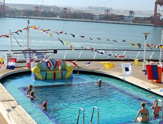 The afternoon evaporated with us getting lots of work done in the comfort of our room. By 4:30pm, we headed up to deck eight, where the sail away party would commence at 5:30pm. There were a few folks outside either sunbathing or swimming. Only the "sun lovers" among the group would be out there. That desert heat combined with some humidity can be dangerous. There was a redeeming breeze, however, that helped cool the air off.