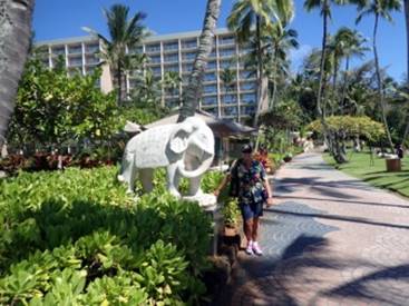 First we walked through the Kauai Marriott Resort Beach Club. The grounds are very nicely landscaped with fountains, ponds, and a garden stream full of koi carp. Some of them are huge, always begging for food. Other interesting residents of the ponds are black neck swans from South America, and the Ne Ne geese, native to Hawaii. Back in 1949, there were only 33 Ne Ne geese left. Almost extinct, the numbers were brought back to over 1000 now.