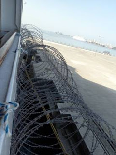 The new addition – razor wire suspended from railing on deck three