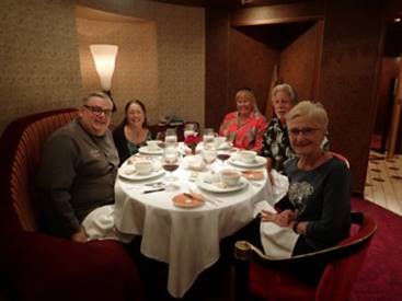 So the four of us met at noon in the restaurant, although it was closed for lunch today. It is always closed for lunch when they have a Captain's dinner, which was tonight. We were seated in the large booth near the entrance, handed special menus, and served wine of our choice. Can you believe they printed four menus titled "Lunch with George Geary" with today's date?